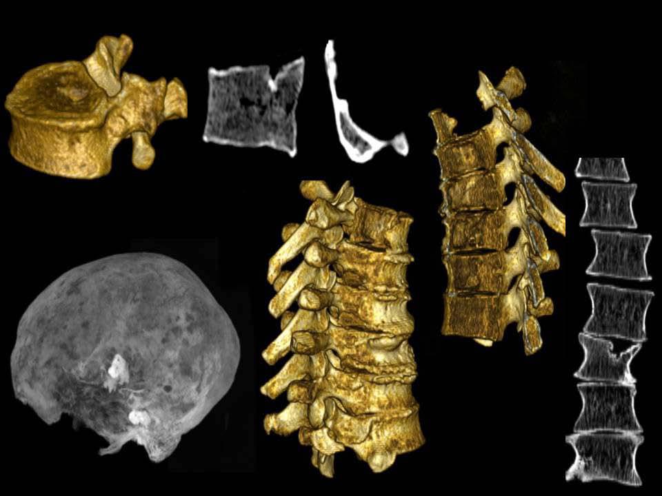 Imágenes de diferentes estudios TC en los que se advierten diferentes patologías. Se aprecian fracturas vertebrales y lesiones líticas craneales, al igual que severos signos de artrosis vertebral. En conjunto, la población analizada, se desenvolvió en un entorno físicamente demandante y proclive a los traumatismos.