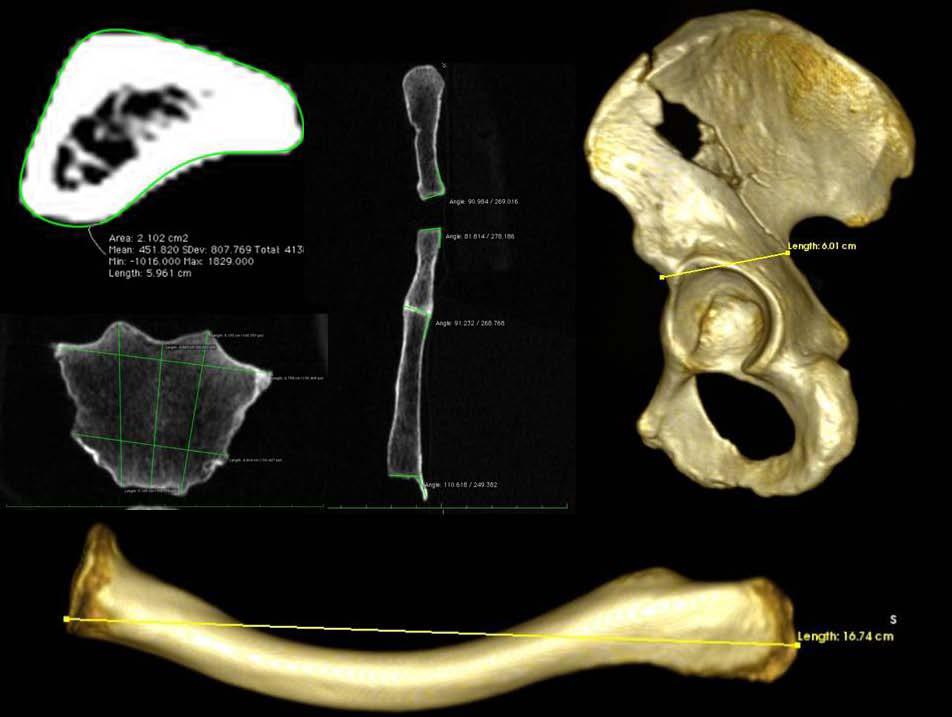 Imatges d’ossos en format radiològic (quatre imatges de l’esquerra) i reconstruïts tridimensionalment. Es pot veure com és possible mesurar tot tipus de paràmetres, externs i interns. Aquests últims, sense necessitat de destruir l’os. Aquestes mesures es van utilitzar per calcular talla i sexe, principalment.