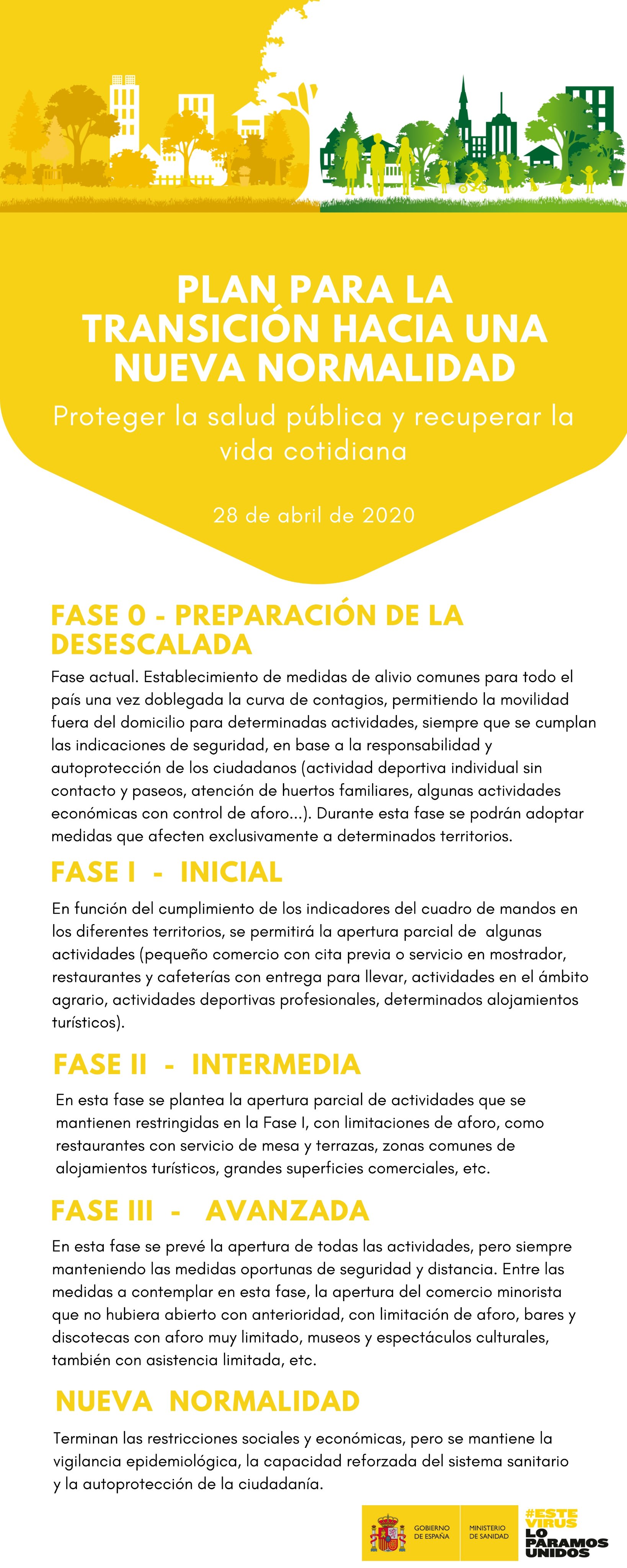 Ver PDF del Plan para la transición hacia una nueva normalidad. Pincha AQUÍ. Ver imagen resumen de las fases del Plan para la transición hacia una nueva normalidad. Pincha AQUÍ.