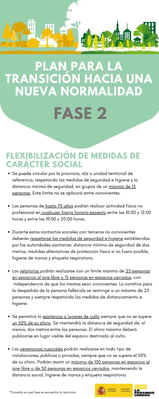 Ver PDF de la Fase 2 del Plan para la transición hacia una nueva normalidad. Pincha AQUÍ. Ver imagen resumen de la Fase 2 del Plan para la transición hacia una nueva normalidad. Pincha AQUÍ. Ver imagen resumen de actividades que se pueden hacer en la Fase 2 del Plan para la transición hacia una nueva normalidad. Pincha AQUÍ.