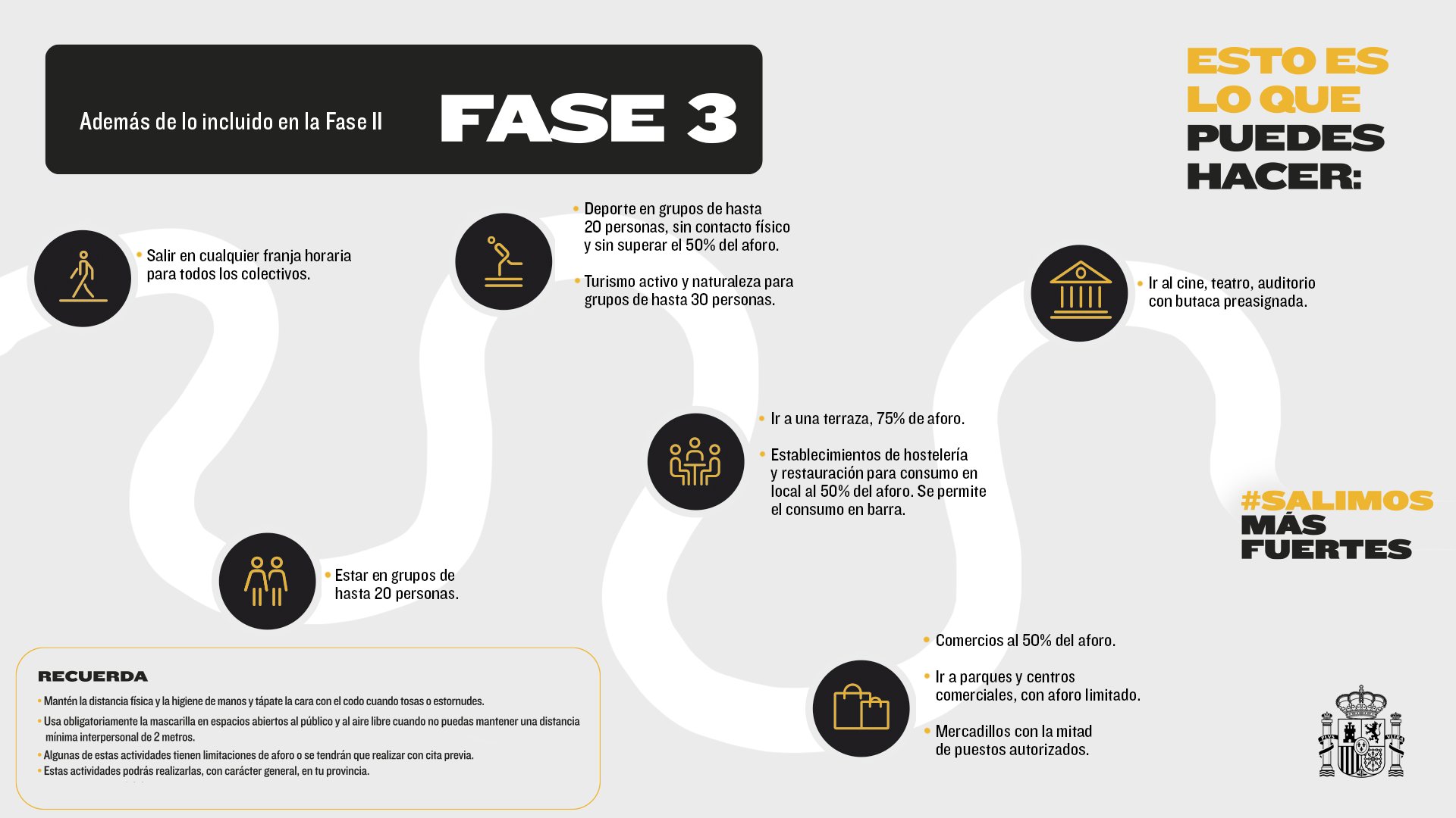 Ver PDF de la Fase 3 del Plan para la transición hacia una nueva normalidad. Pincha AQUÍ. Ver imagen resumen de actividades que se pueden hacer en la Fase 3 del Plan para la transición hacia una nueva normalidad. Pincha AQUÍ.